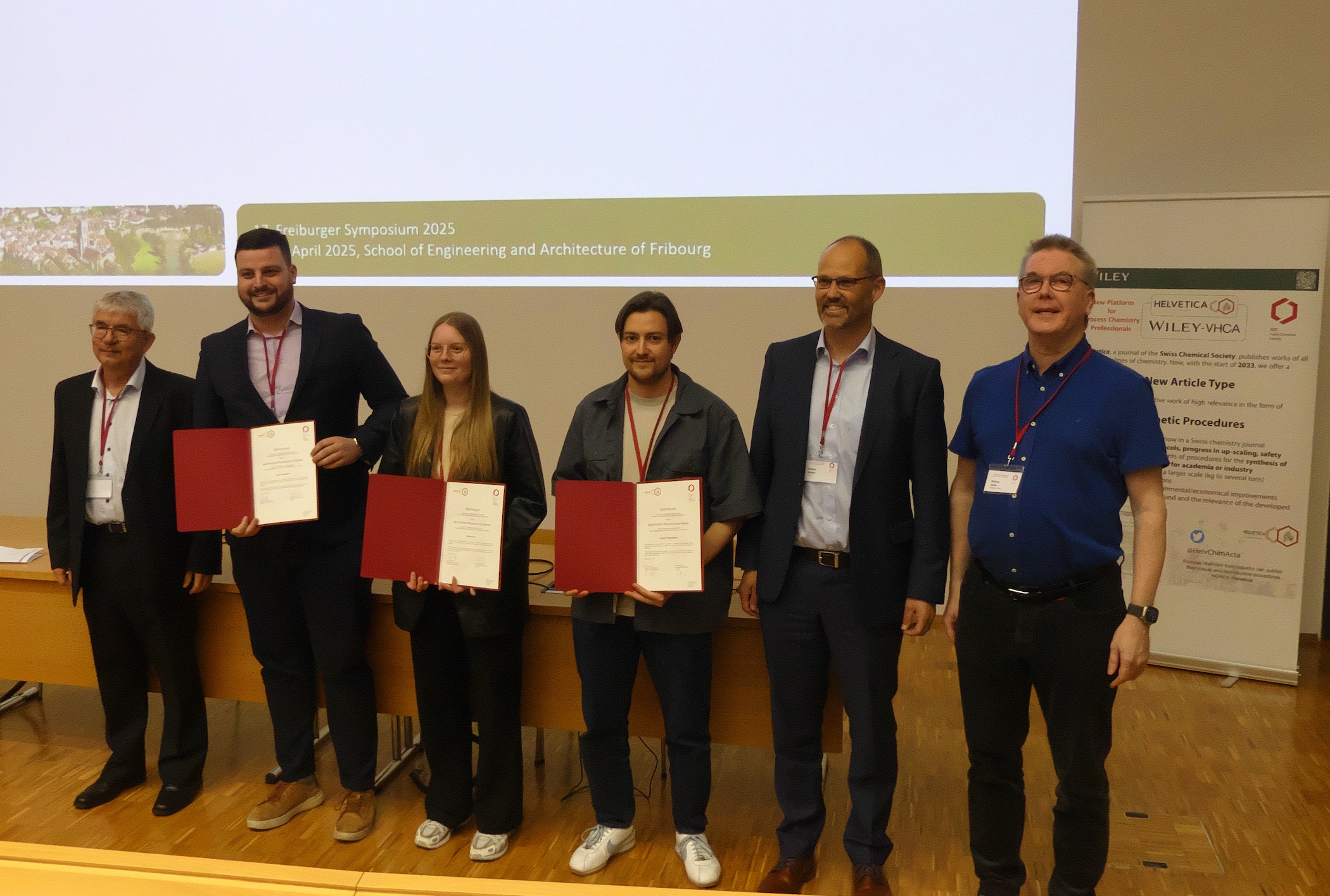 Congratuatlions to Fabio Casanova, dsm-firmenich (left), Pauline Daul, HES-SO Fribourg (middle) and Vincent Freiburghaus, University of Zurich (right) for their outstanding poster presentations at the 17. Freiburger Symposium 2025. The award included a certificate and prize money of 200 CHF each.