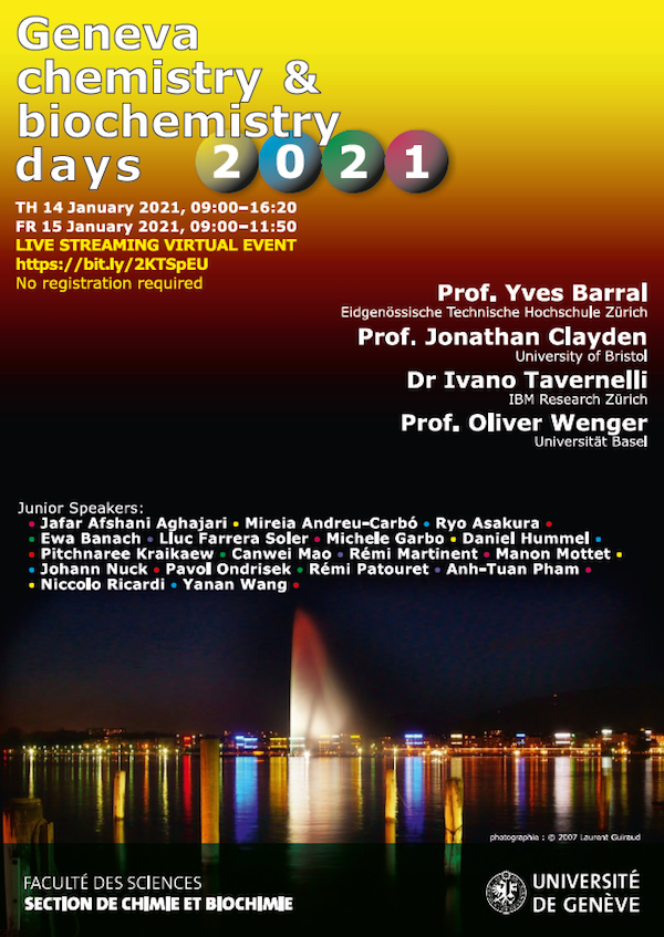 The Section de chimie et biochimie, University of Geneva, has the pleasure to announce the 11th edition of its “Geneva Chemistry & Biochemistry Days”. Due to the sanitary situation, the event will be held at distance, via the Zoom interface (https://unige.zoom.us/j/92682442652 + code GCBD2021 or directly https://bit.ly/2KTSpEU; but we are convinced that the spirit of the event will not be impaired by this mishap.