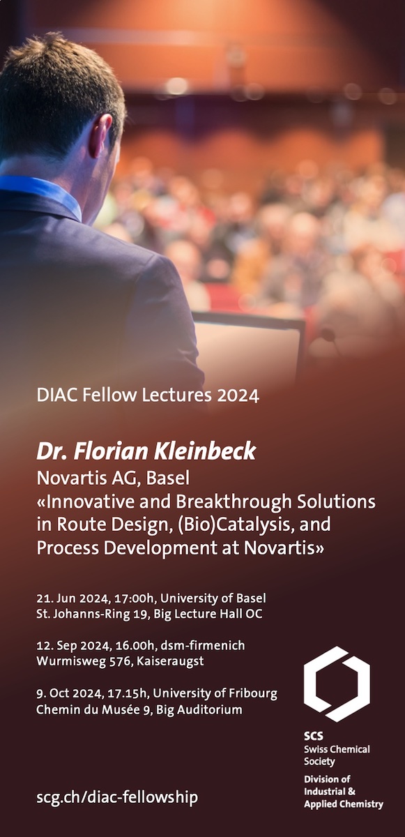 The nomination as DIAC Fellow is granted to distinguished scientists from Industry for significant contributions and innovations over many years in the field of industrial chemistry and chemical process technology in Switzerland. The yearly award is sponsored by the Division of Industrial & Applied Chemistry (DIAC) of the Swiss Chemical Society and consists of a prize sum of CHF 1’000 as well an invitation to give lectures at Swiss academic and industrial institutions.