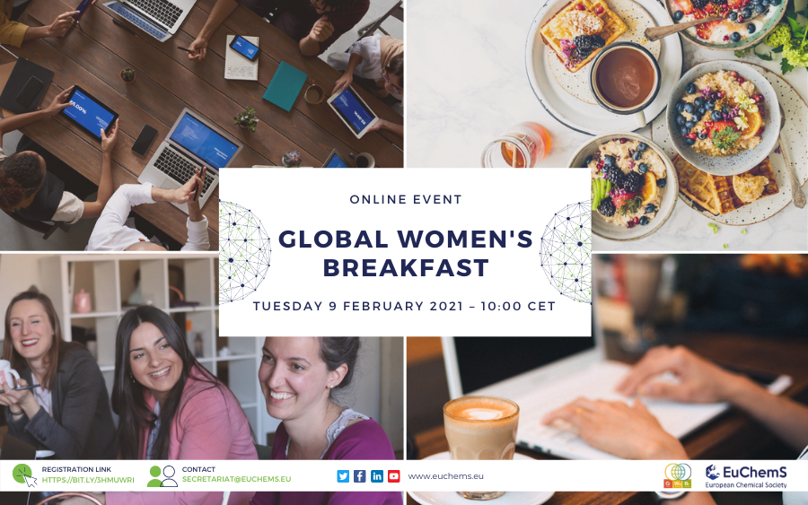 On the occasion of the Global Women’s Breakfast 2021 #GWB2021, the European Chemical Society (EuChemS) is pleased to organise its own online event. You are invited to join us on Tuesday 9 February 2021, from 10:00 to 11:00 CET on Zoom.
