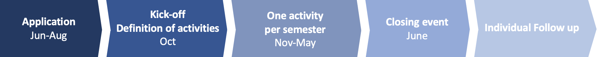 Four regional clusters, each consisting of a managing team, mentors and mentees, will be established. Each cluster will define the activities, one per semester, at its “kick off meeting”. At the end of the year, the cluster will meet for a closing event.