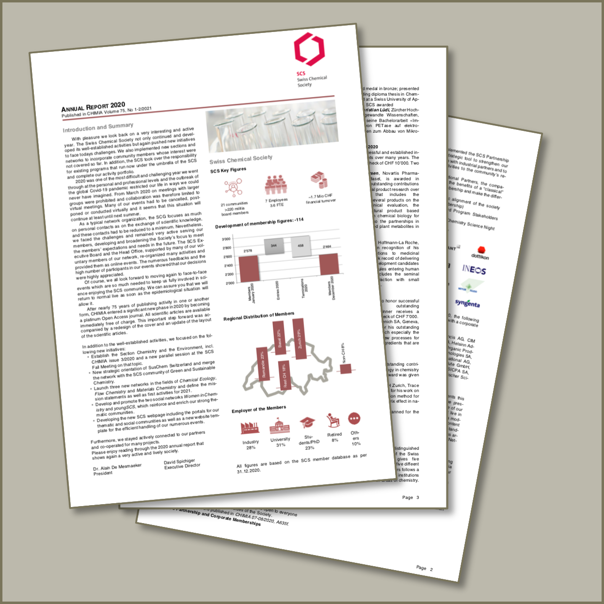 With pleasure we look back on a very interesting and active year. The Swiss Chemical Society not only continued and developed its well-established activities but again pushed new initiatives to face today’s challenges. We also implemented new programs to incorporate community members whose interest were not covered so far. We successfully organized more than twenty on-site symposia and congresses respectively and were able to generate an important contribution to the exchange between academia and industry.