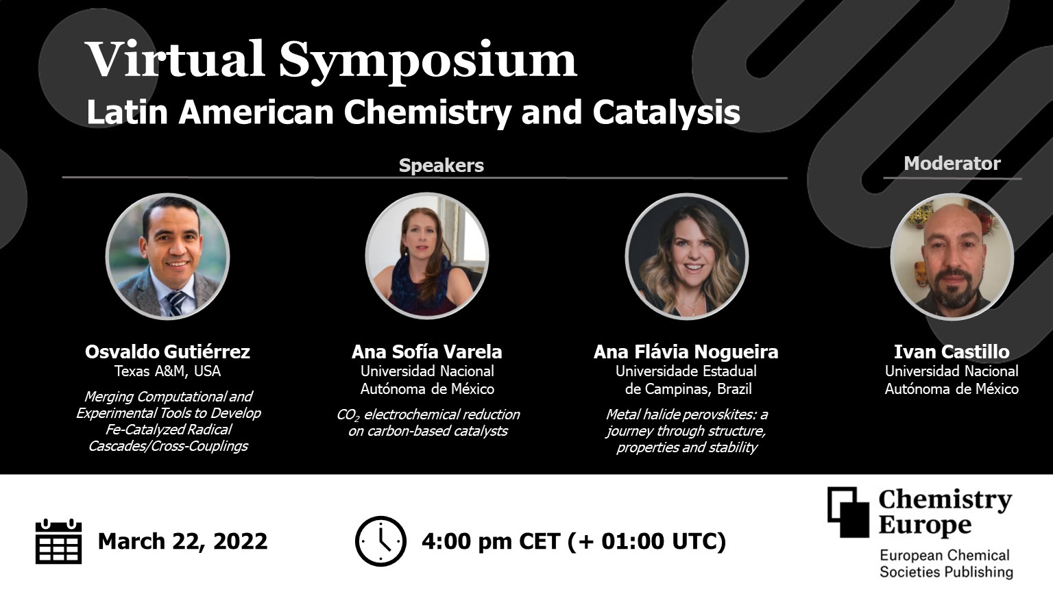 This exciting event will be moderated by Ivan Castillo (Instituto de Química, UNAM, Mexico) and hosted by Sandra González Gallardo (Deputy Editor, EurJIC and ChemCatChem). Please them and their speakers Osvaldo Gutiérrez (Texas A&M University, USA), Ana Sofía Varela (Universidad Nacional Autónoma de México), andAna Flávia Nogueira (Universidade Estadual de Campinas, Brazil) for this virtual symposium. The topics will span from computational and experimental catalysis for organic synthesis to bioinorganic chemistry, electrocatalysis, and photocatalysis: